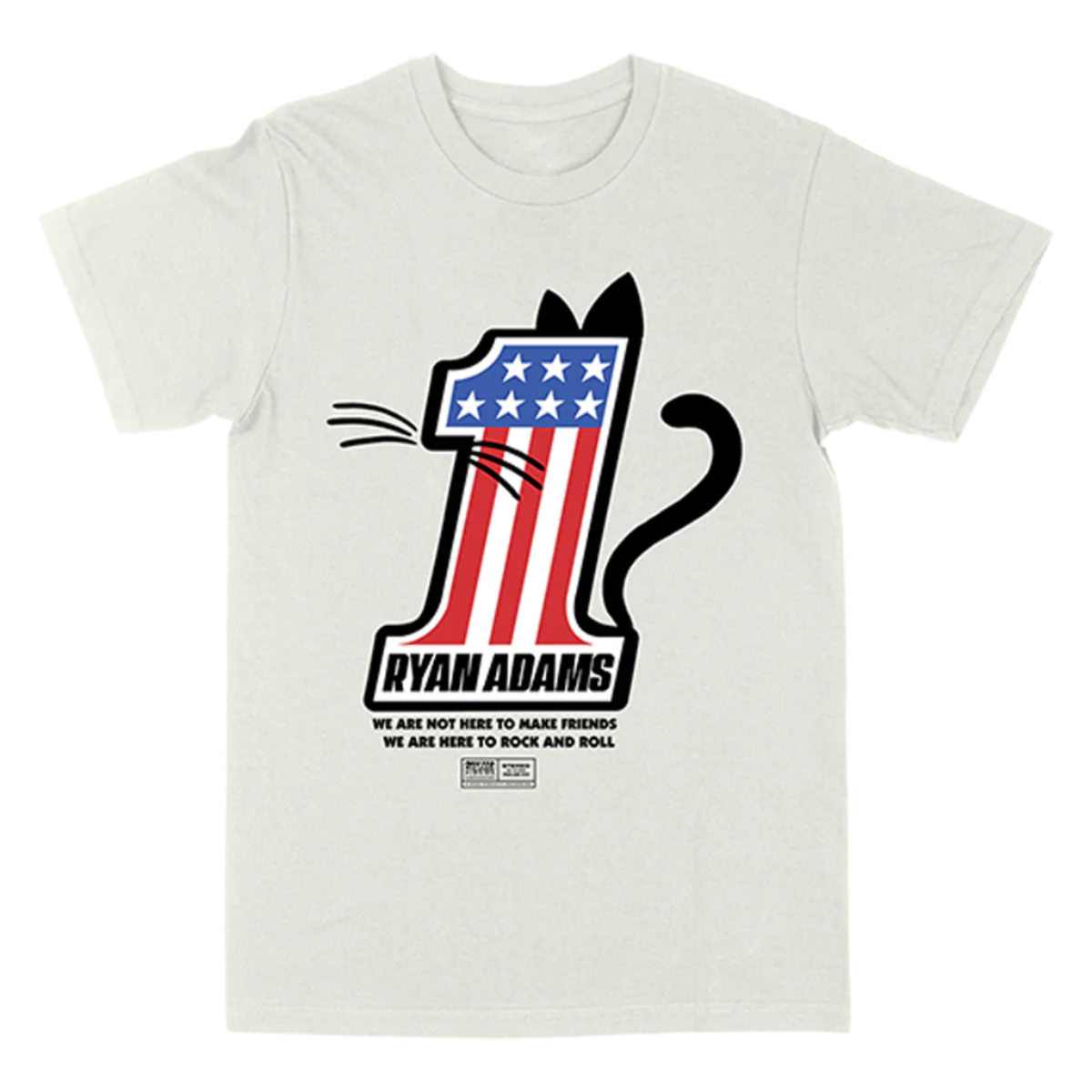 Vintage white crewneck unisex t-shirt with new cat one design and Ryan Adams logo printed on front